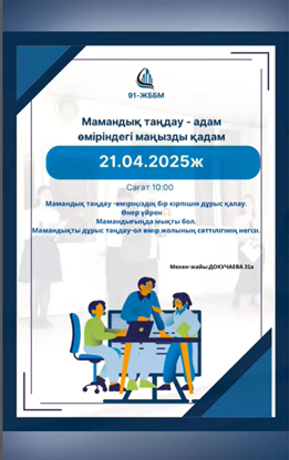 21.04.25 ж. 91 ЖББ мектепте Елбасы Қасым-Жомарт Тоқаевтың жарлығымен 2025 жыл “Жұмысшы мамандықтар жылы” деп жариялауына орай, кәсіптік білім беру аясында 8-9 сынып оқушыларына мектебіміздің ауласына “Мамандықтар жәрменкесін” ұйымдастырылды.