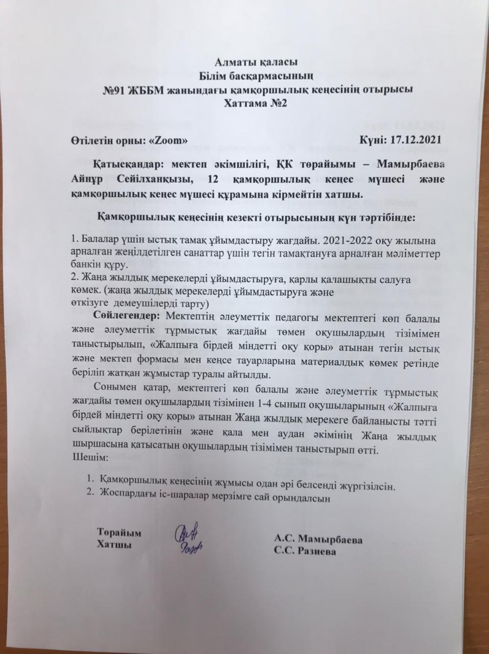 "№91 жалпы білім беретін мектеп" КММ-нің қамқоршылық кеңесінің отырысы