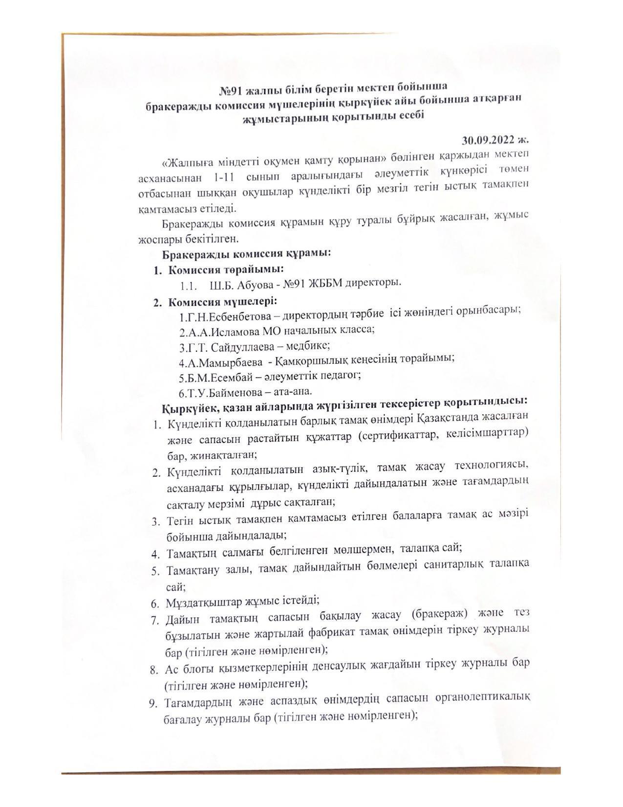 » Бракеражды комиссияның қыркүйек айы бойынша қорытынды есебі