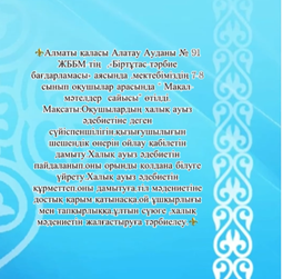Алматы қаласы Алатау Ауданы № 91 ЖББМ-тің ,«Біртұтас-тәрбие бағдарламасы» аясында ,мектебіміздің 7-8 сынып оқушылар арасында «Мың бір мақал,жүз бір жұмбақ»сайысы өтілді.Мақсаты:Оқушылардың халық ауыз әдебиетіне деген сүйіспеншілігін,қызығушылығын шешендік өнерін ойлау қабілетін дамыту.Халық ауыз әдебиетін пайдаланып,оны орынды қолдана білуге үйрету.Халық ауыз әдебиетін құрметтеп,оны дамытуға,тіл мәдениетіне достық қарым-қатынасқа,ой-ұшқырлығы мен тапқырлыққа,ұлтын сүюге ,халық мәдениетін жалғастыруға тәрбиелеу.
