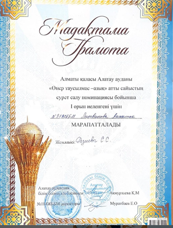 мектептерінің арасында өткен “Өнер таусылмас-азық” сайысында сурет салу номинациясы бойынша 5В сынып оқушысы Литвинова Анжелика қатысып 1 орын иеленді.жетекшісі: Разиева С.С
