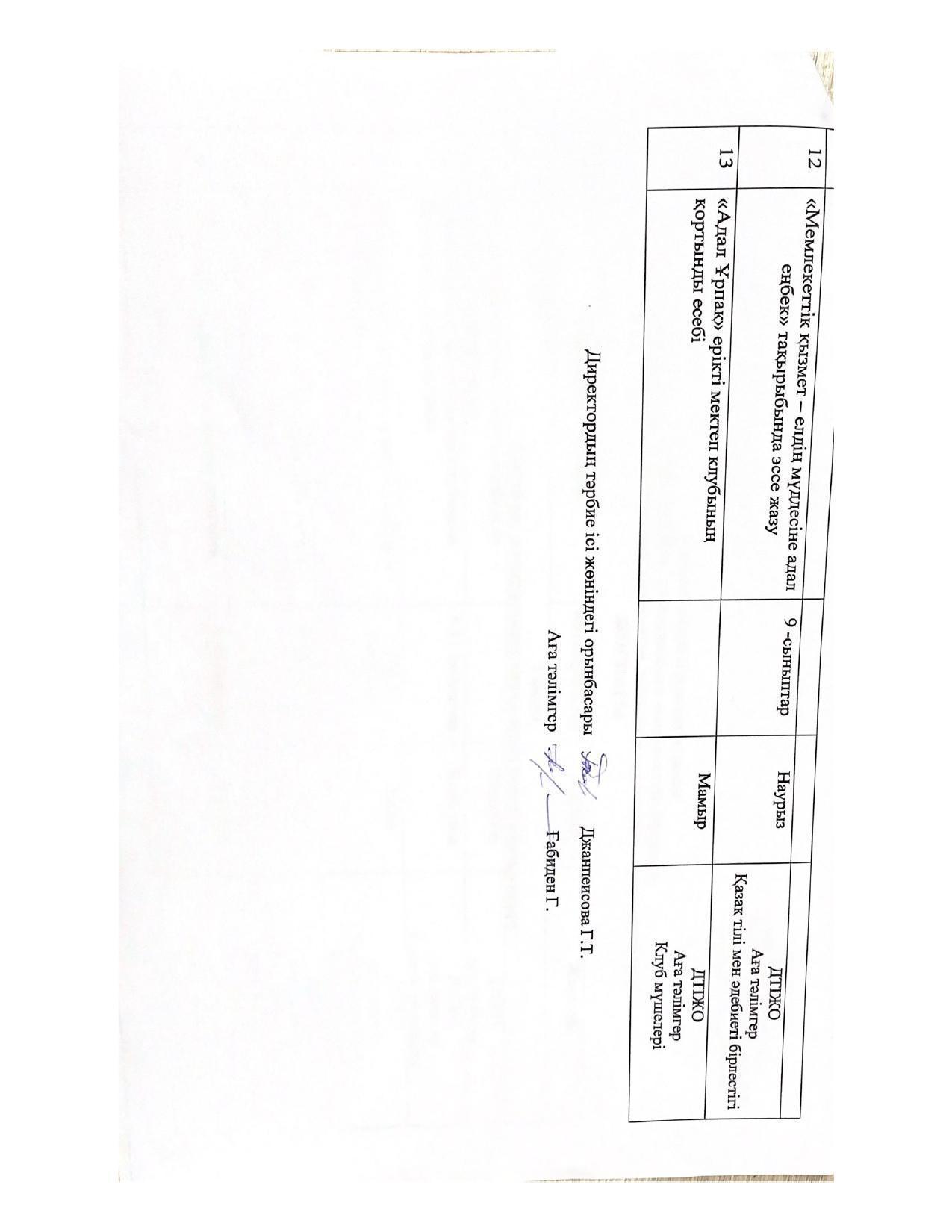 11 декабрь 2023 0 1 2 3 4 5 "Адал Ұрпақ" ерікті мектеп клубының жұмыс жоспары "Адал Ұрпақ" ерікті мектеп клубының 2023-2024 оқу жылына арналған жұмыс жоспары