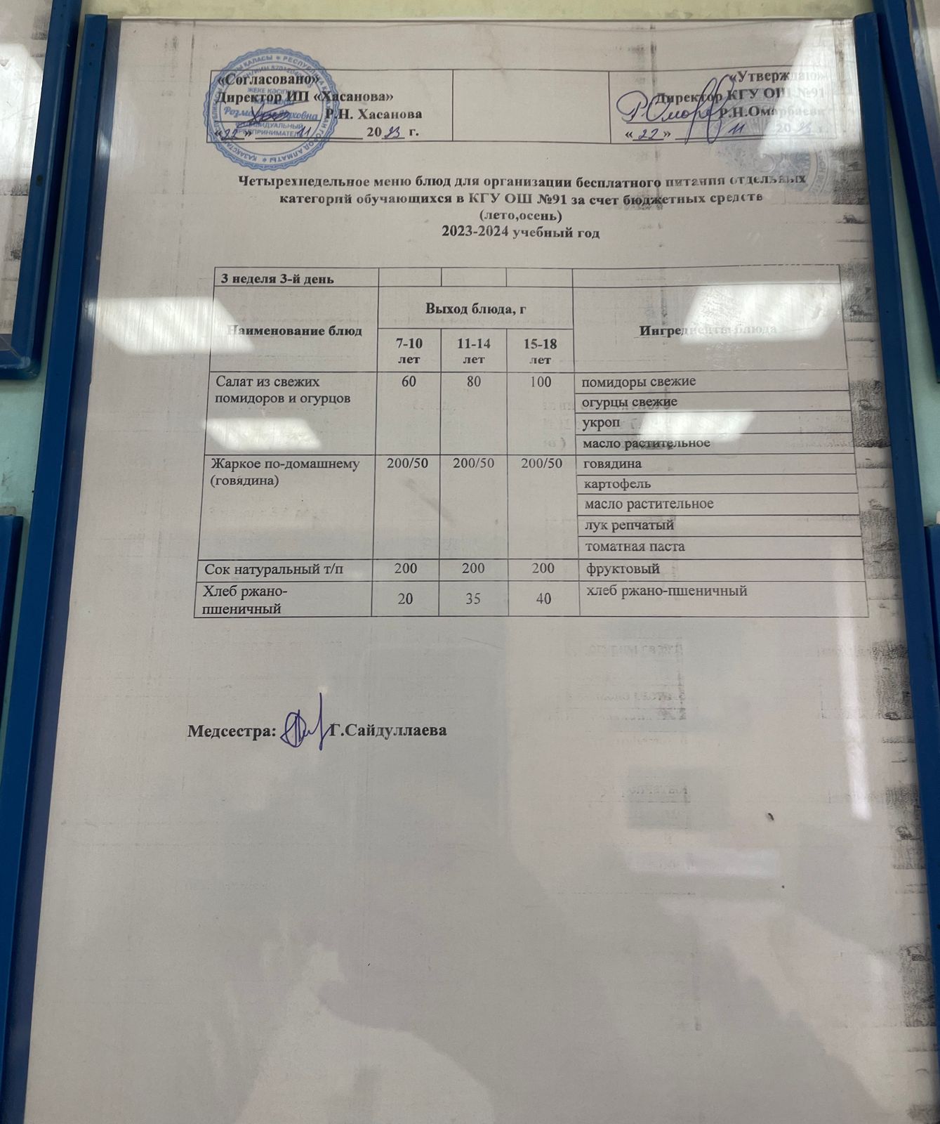 Тағамдар мәзірі. 3 апта 3 күн (22.11.2023). Меню блюд. 3 неделя 3