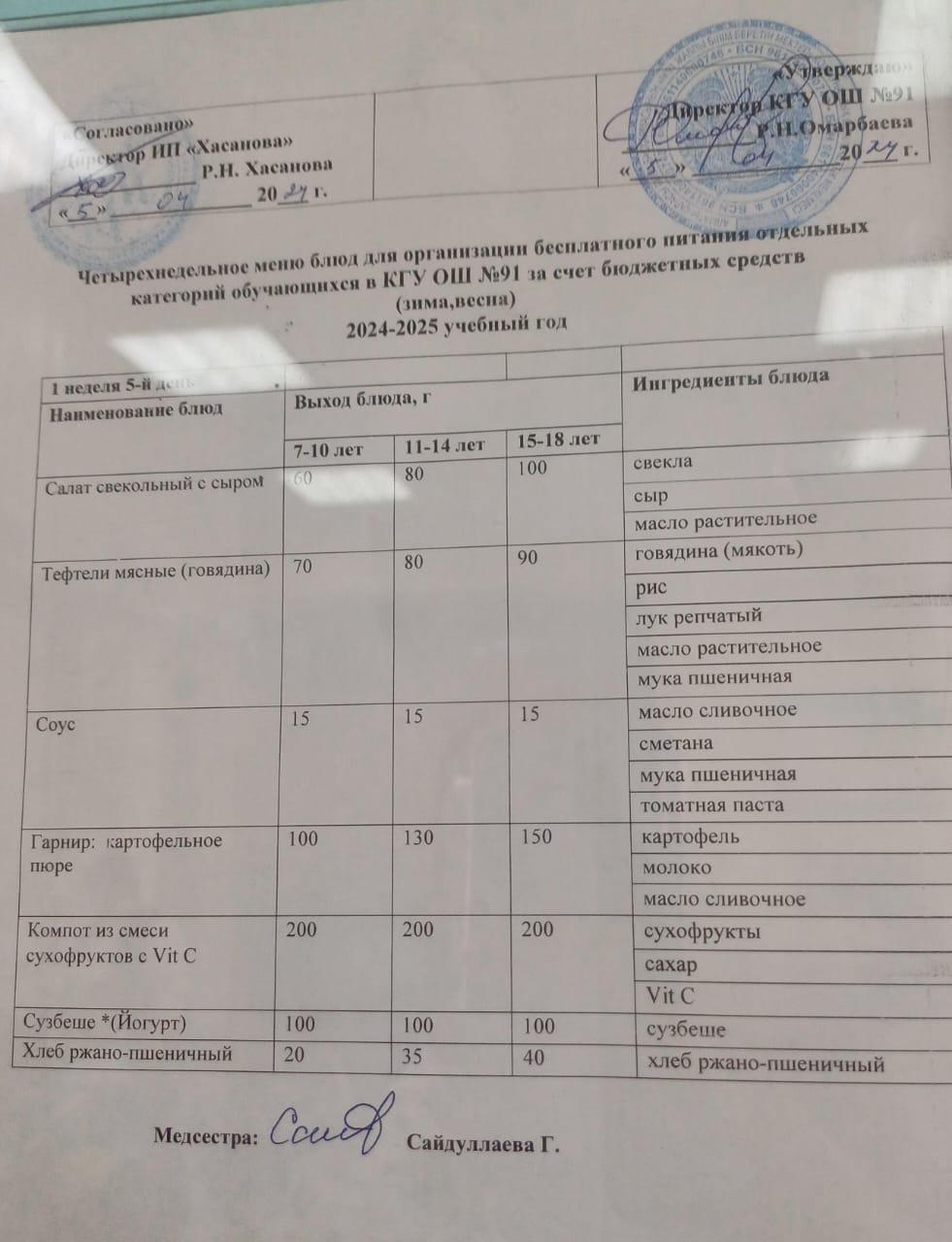 » Тағамдар мәзірі. 1 апта 5 күн (05.04.2024). Меню блюд. 1 неделя 5