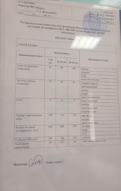 Тағамдар мәзірі 1 апта 1 күн (28.04.2025). Меню блюд.